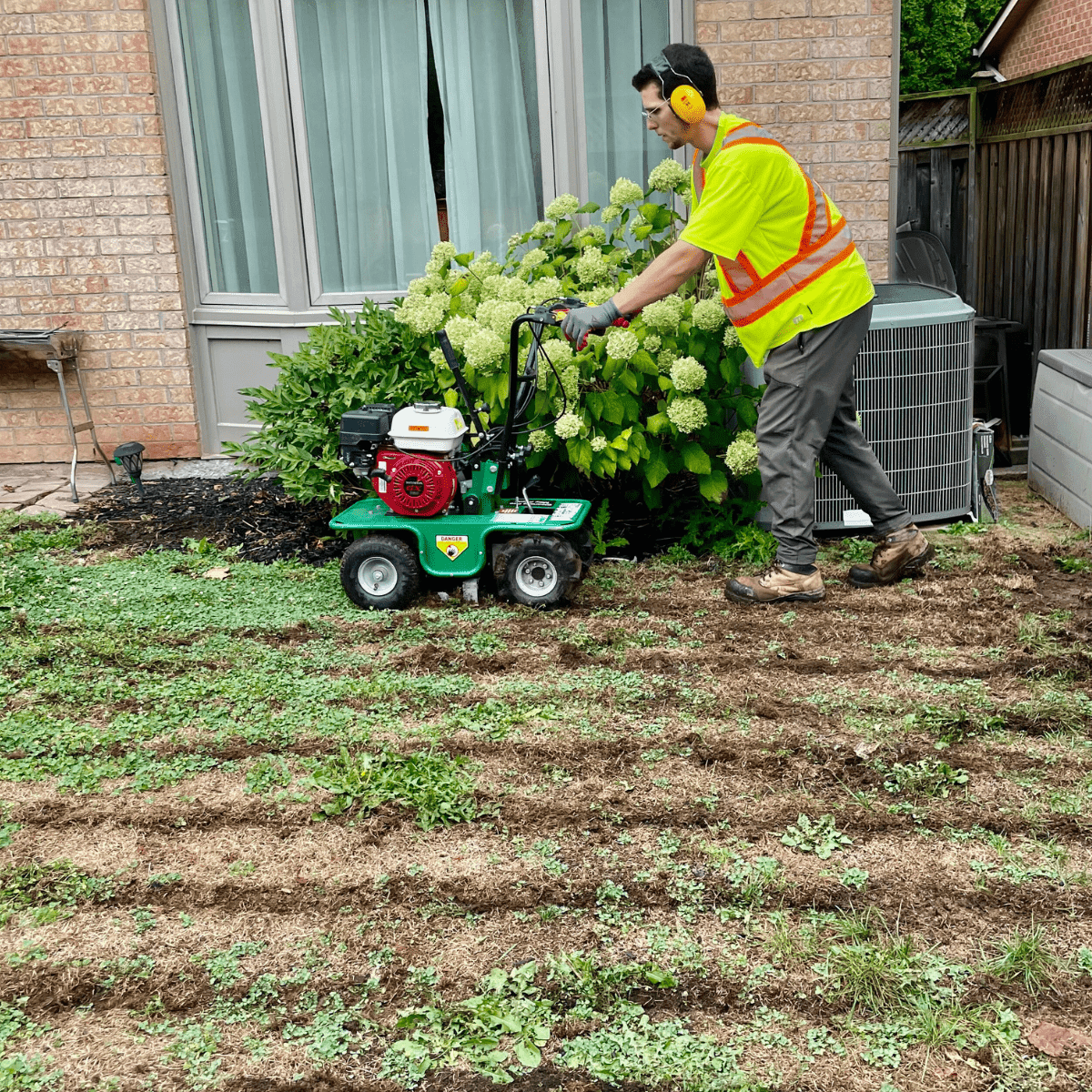 - Remove existing lawn with sod cutter, haul and dump debris off-site.