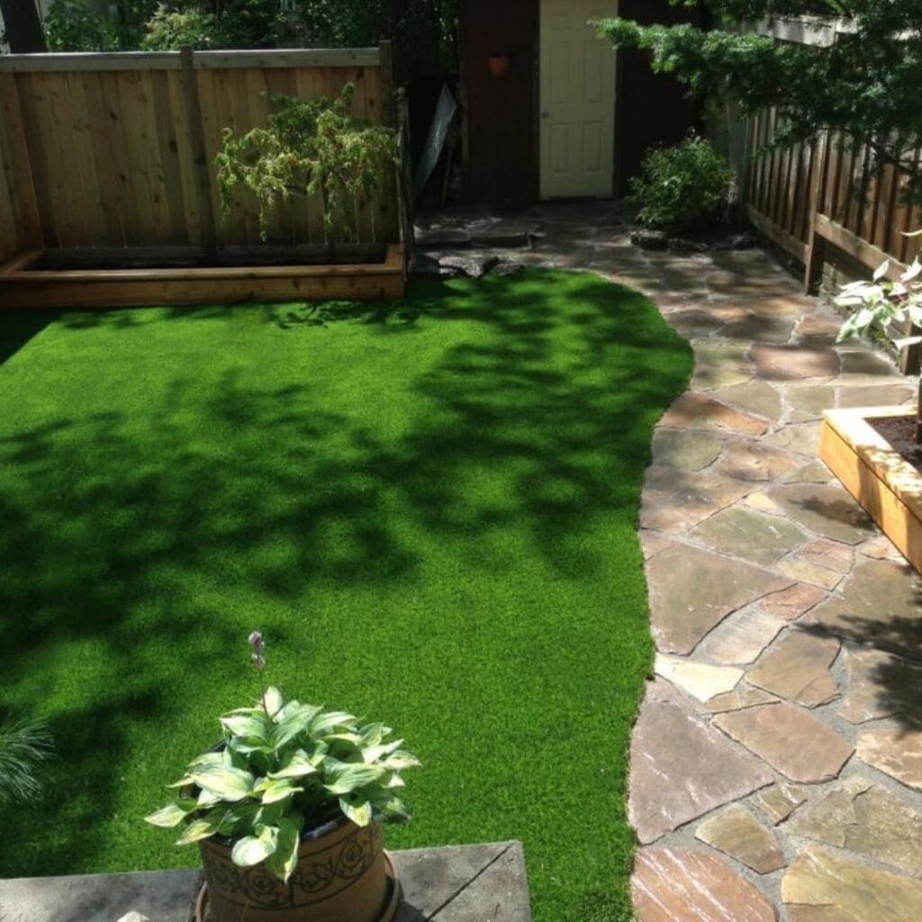 Every installation includes a minimum 4-inch excavation with all debris removed off-site, triple-woven landscape fabric, and a layer of high-performance bedding (HPB) stone for proper leveling and drainage. Your chosen turf is then installed using galvanized spikes and infill to suit your lawn’s needs. Optional underlayment can be added for a softer feel underfoot.