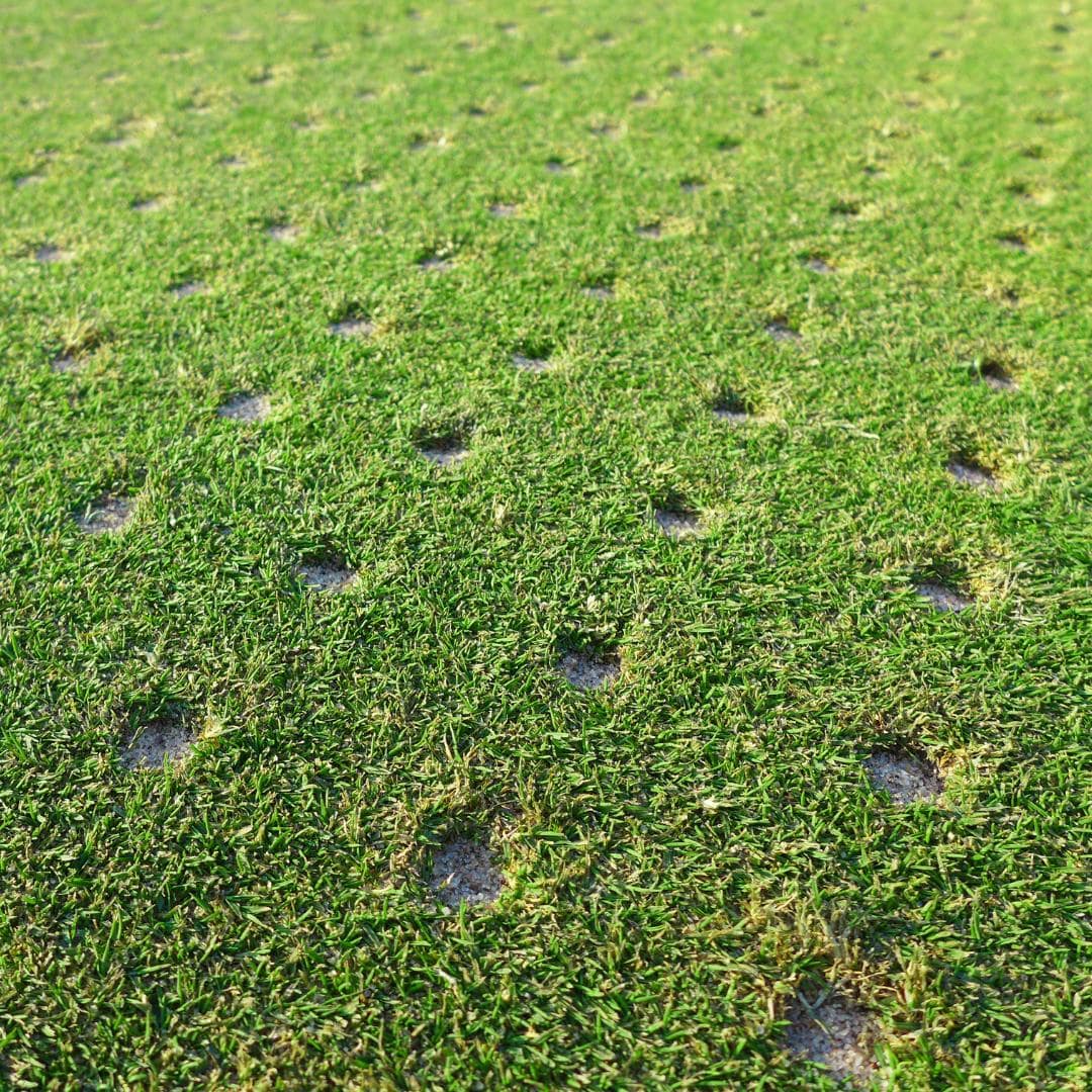 Lawns can become compacted over time due to foot traffic, machines (e.g., mowers), and children or pets playing, which can prevent oxygen, water, and nutrients from reaching the root system. Core aeration uses an aerator with tines to remove small plugs of soil, relieving compaction. It is recommended to aerate in Spring or Fall to avoid overstressing the lawn, and the core plugs should be left to naturally break down.
